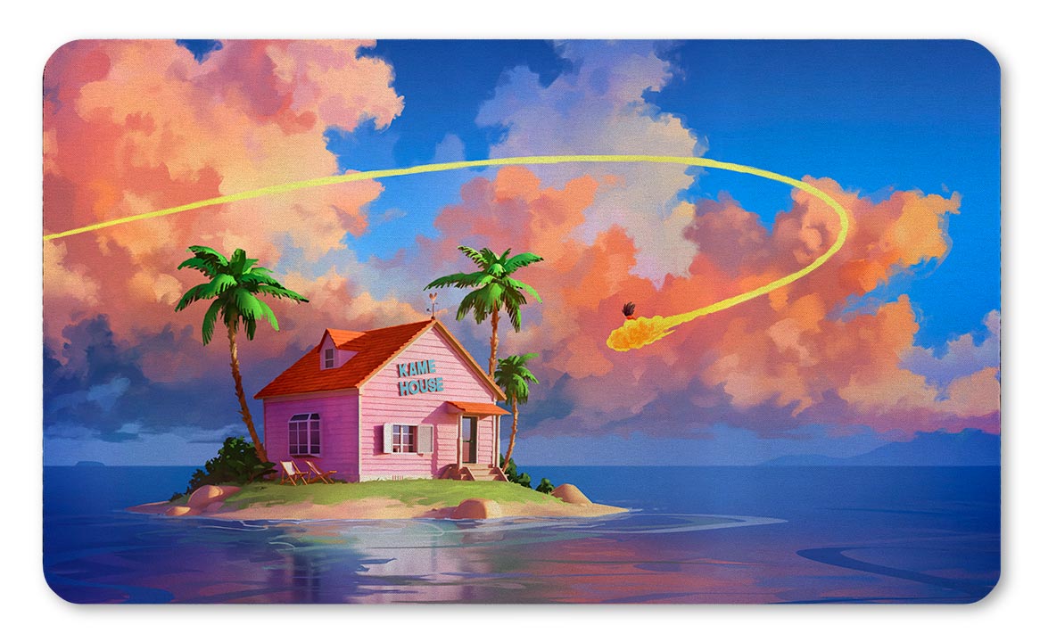 Este <strong>Playmat Kame House captura la icónica casa de entrenamiento de Dragon Ball en una isla tranquila, rodeada de mar y un cielo espectacular. Perfecto para los fans que buscan un toque de serenidad en sus partidas.