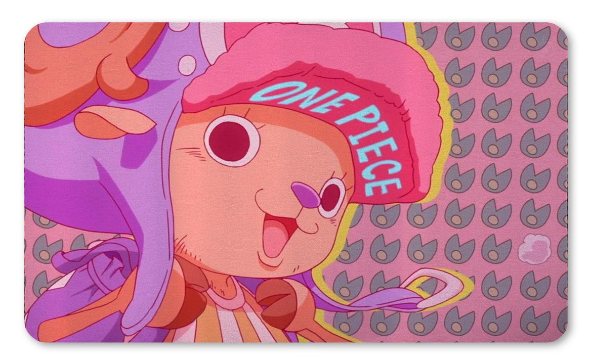 La ilustración del tapete muestra a Chopper en un primer plano muy expresivo, destacando su gorro con el texto «ONE PIECE» integrado. El fondo presenta un patrón geométrico retro en tonos rosados y púrpuras que resalta la figura del personaje con un delineado amarillo estilo neón. Es perfecto si te gustan los setups de escritorio con temática estética (aesthetic), colores suaves o si juegas mazos de Chopper en One Piece Card Game.